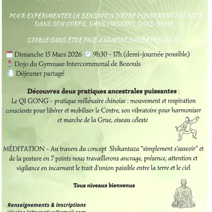 Le Qi Gong offre une voie concrète pour retrouver cet ancrage. À travers des mouvements lents et conscients, des étirements des méridiens, des sons vibratoires et la Marche de la Grue, oiseau céleste et symbole de longévité, il invite le Qi à descendre, à se déposer, à circuler librement entre Ciel et Terre.