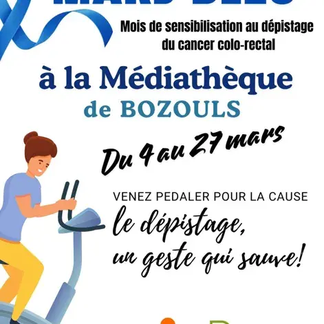 Venez pédaler à la médiathèque André Baudon à l'occasion de Mars bleu, le mois du dépistage du cancer colo-rectal, avec le Comité de l’Aveyron de la Ligue contre le cancer.