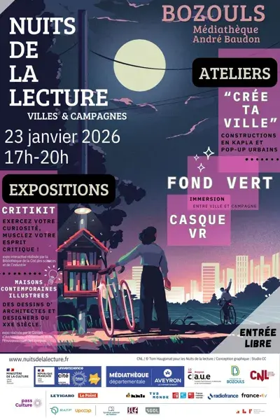 À l’occasion des Nuits de la lecture, la Médiathèque André Baudon de Bozouls vous invite à une soirée pleine de découvertes autour du thème 2026 "Villes & campagnes". Petits et grands pourront participer à une riche variété d’ateliers : "Crée ta ville" constructions en Kapla ou à partir de pop-up urbains, immersion fond vert et découverte en casque VR pour voyager entre espaces urbains et paysages ruraux.