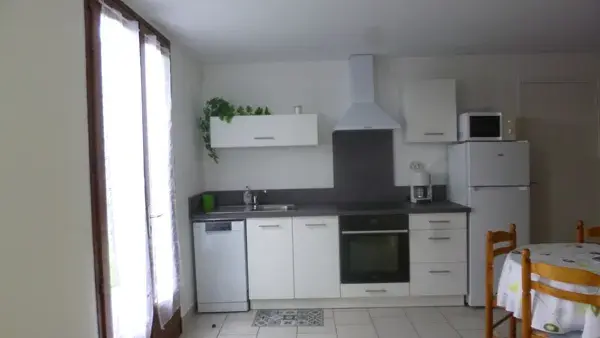 Coin cuisine équipée (plaques induction, four chaleur tournante, micro-ondes, réfrigérateur / congélateur, lave-vaisselle).